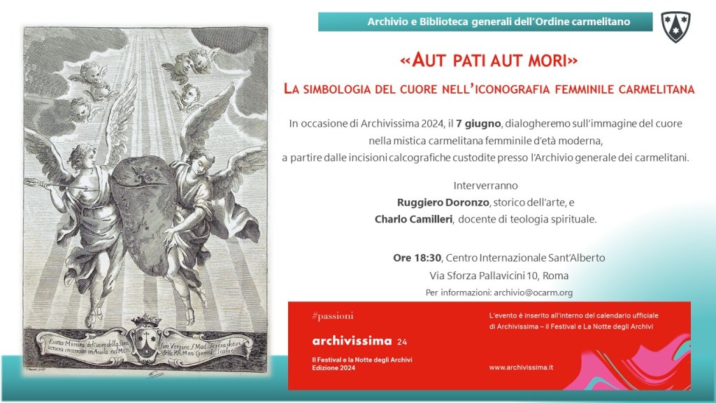 Dal 6 al 9 giugno si svolgeranno in tutta Italia le iniziative culturali dell’evento Archivissima 2024 – Il Festival e la Notte degli Archivi, dedicato al tema #Passioni. Per tale occasione l’Archivio e la Biblioteca generali dei carmelitani hanno organizzato una tavola rotonda dal titolo: «Aut pati aut mori». La simbologia del cuore nell’iconografia femminile carmelitana.