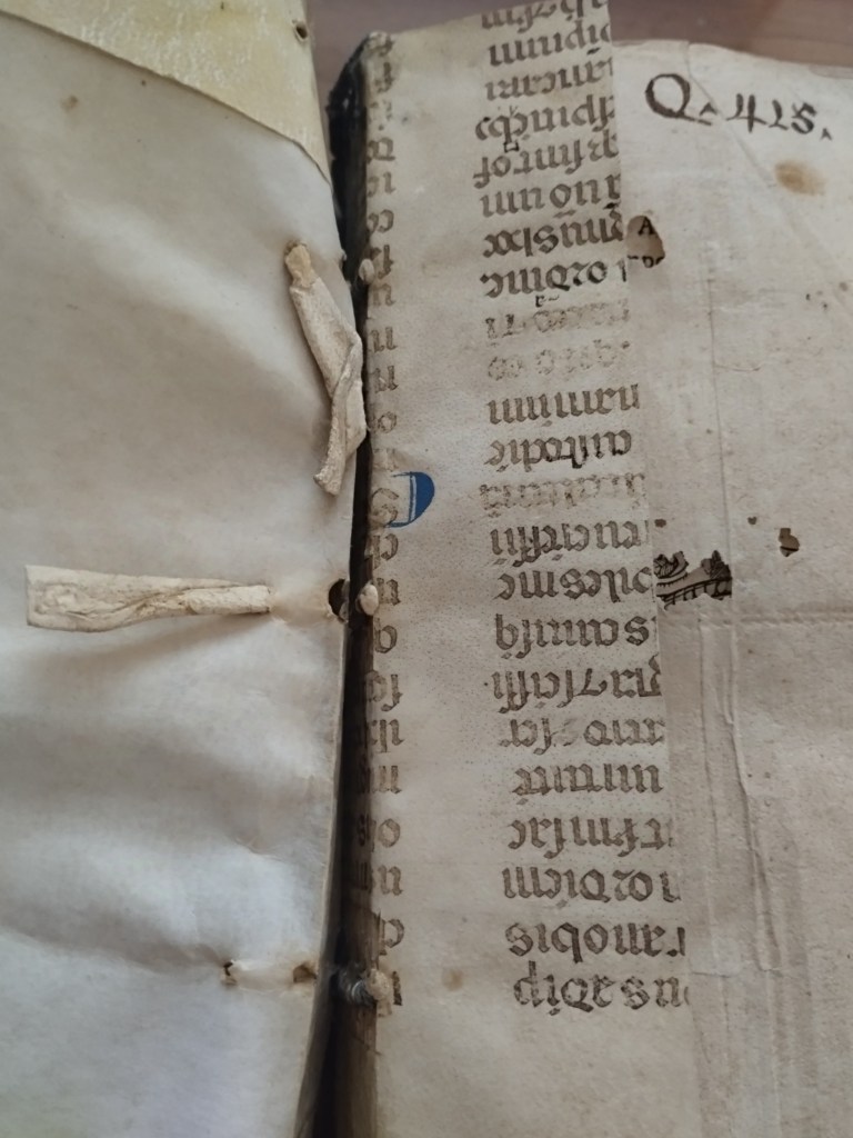 Qui in basso vi mostriamo un esempio di reimpiego di un frammento pergamenaceo, proveniente da un manoscritto gotico (attribuibile, con ogni probabilità, al XIV secolo), contenente un testo religioso non identificato e riutilizzato per l’indorsatura di un volume di Sermoni, quest’ultimo stampato a Lione nel 1557.
