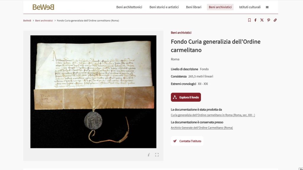 Nella homepage di BeWeB, selezionando la categoria “Beni archivistici” e inserendo nell’apposita stringa di ricerca il nome dell’ente conservatore (Archivio generale dell’Ordine carmelitano), è possibile accedere alla descrizione della documentazione cliccando sull’icona “Fondo Curia generalizia dell’Ordine carmelitano”. Nella pagina specifica che si aprirà, sarà possibile esplorare il complesso documentario. In particolare, si potranno trovare notizie relative al soggetto produttore, al soggetto conservatore, all’articolazione in sezioni, serie e sottoserie, alle consistenze e agli estremi cronologici della documentazione conservata, agli strumenti di ricerca già esistenti e alle modalità di accesso all’archivio. Piano piano aggiungeremo descrizioni sempre più analitiche.