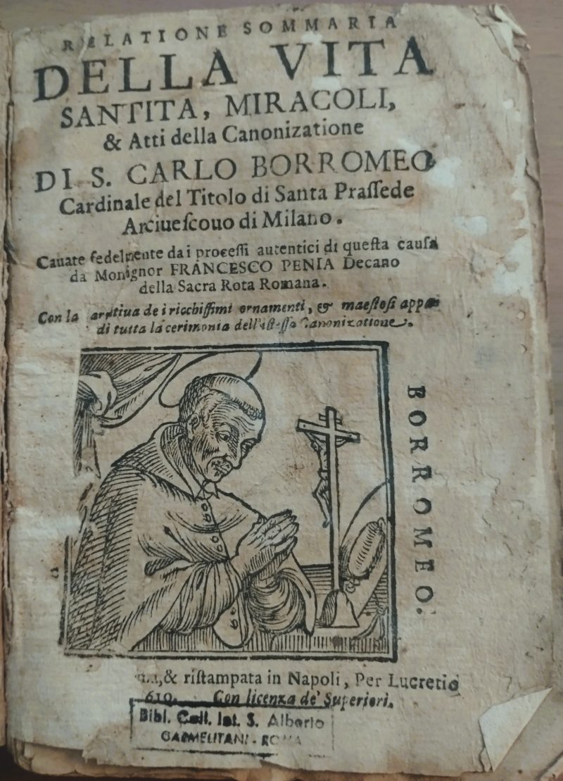 La Biblioteca Generale Carmelitana conserva un piccolo volume a stampa del 1610, contenente una relazione sommaria della vita e dei miracoli di san Carlo Borromeo e della sua canonizzazione, avvenuta a Roma il 1° novembre di quello stesso anno, durante il pontificato di Paolo V Borghese.