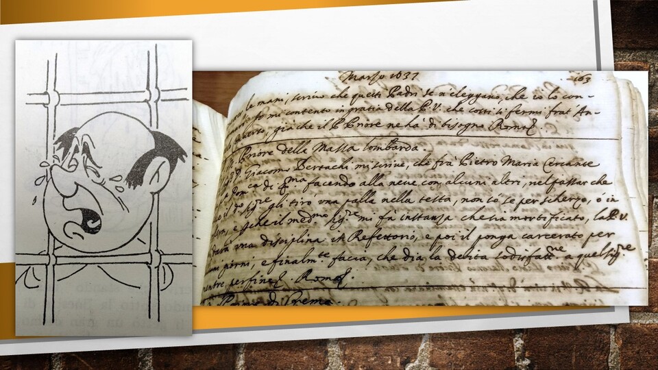 Era il mese di marzo dell’anno 1637 e il priore generale dei carmelitani Teodoro Straccio scriveva al priore del convento di Massalombarda, località non lontana da Ravenna, per risolvere una questione imbarazzante. Erano giunte fino a Roma le vivaci lamentele del signor Giacomo Bertachi, circa il comportamento irriverente di un certo fra’ Pietro Maria, questuante appartenente al suddetto convento carmelitano. Infatti nella prima domenica di Quaresima (il 1° marzo 1637) fra’ Pietro, giocando insieme ad alcuni suoi compagni dopo una bella nevicata, aveva tirato una palla di neve in testa al signor Bertachi, che passava di là, non si sa se per scherzo o per collera.