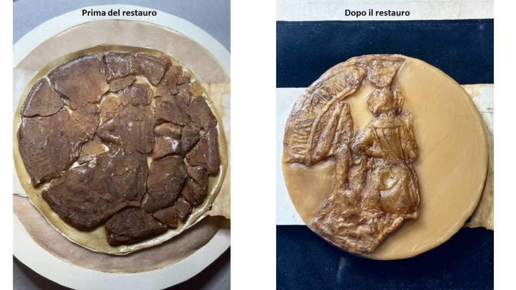 Infatti, tra il 2023 e il 2024 il dottor Luca Becchetti, Conservatore dei Sigilli dell’Archivio Vaticano e Responsabile del laboratorio di restauro Sphragis, ha riportato all’antica bellezza un totale di 87 sigilli in cera, 50 ancora attaccati alle originarie pergamene e 37 staccati, caduti da privilegi vescovili e bolle pontificie a causa dell’usura del tempo oppure da essi recisi in conseguenza della vecchia abitudine, non più accettabile secondo le moderne tecniche di conservazione, di custodirli separatamente dai documenti membranacei di provenienza.